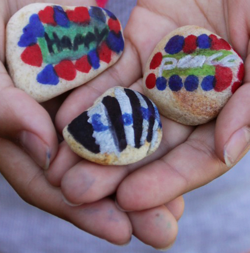 Create guerilla art. Decorate stones to leave at the park; create origami animals to place in small nooks or hang from trees; make a wish tree in your front yard or at the park; write cheery messages with sidewalk chalk; or fill an envelope with interesting stuff (stickers, tattoos, bookmark, dried flowers) and leave it on a park bench addressed "For You."